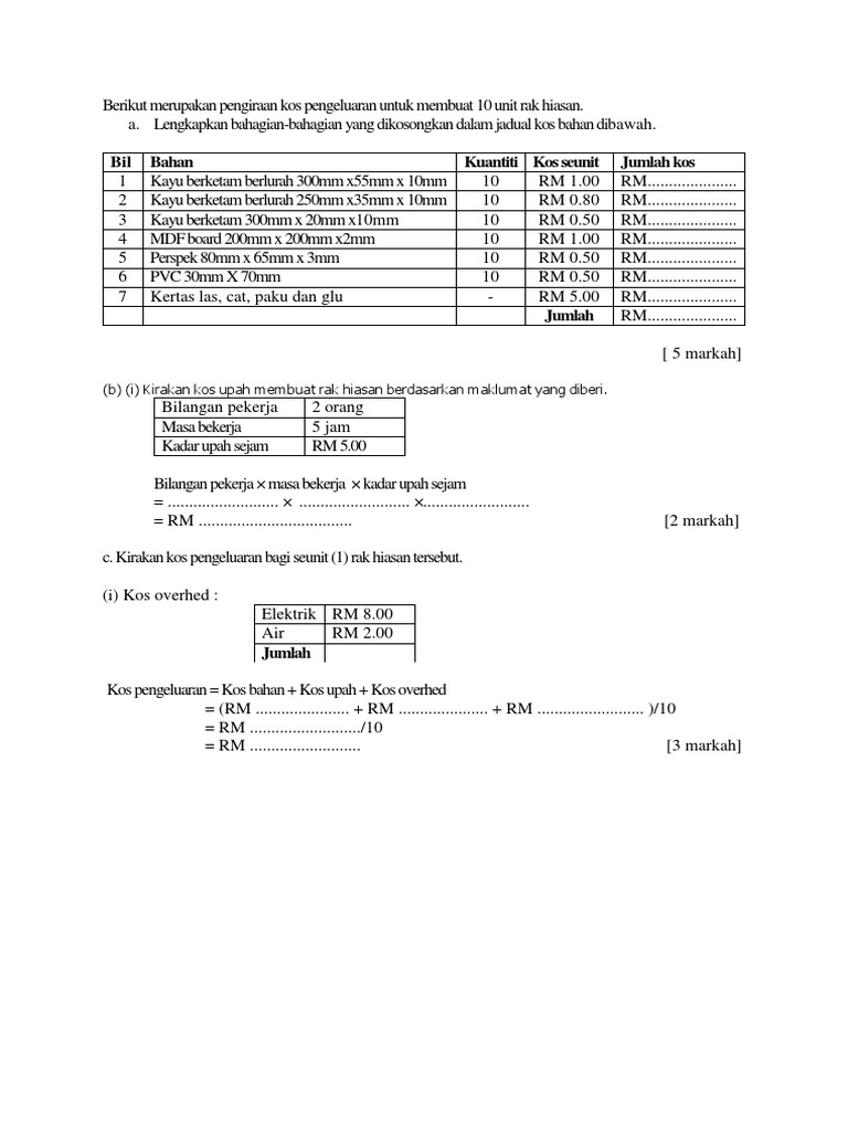 Jumlah kos bahan BIL BAHAN KUANTITI KOS SEUNIT RM KOS SEBENAR RM 1 Kayu berlurah 10 x 45 X 460 100 300. Memberi konsep dan ciri kos relevan. 75000 55000 27000.
